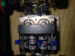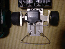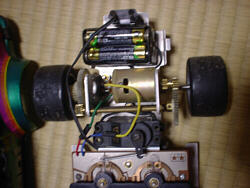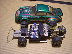 木下「そう、今を去ること四半世紀前の1976年12月発売、伝説のタミヤRCシリーズ第一弾『ポルシェターボRSRタイプ934』です。ごらんの通りシャシーは原型そのまま、とうの昔に腐ってしまったNi-Cdバッテリーなんかに目もくれず、ちゃんと乾電池で今でもトコトコ走ります。どうです、このバッテリーパック時代には考えられない並列/直列切り替え式前後進二段変速スイッチに、工作セットから流用したのがミエミエの、左右で最大舵角がぜんぜん違うステアリングリンケージ、今の子供が見向きもしないマブチRE360モーターをなんと2段減速です。子供の玩具としてはもってこいでしょう」