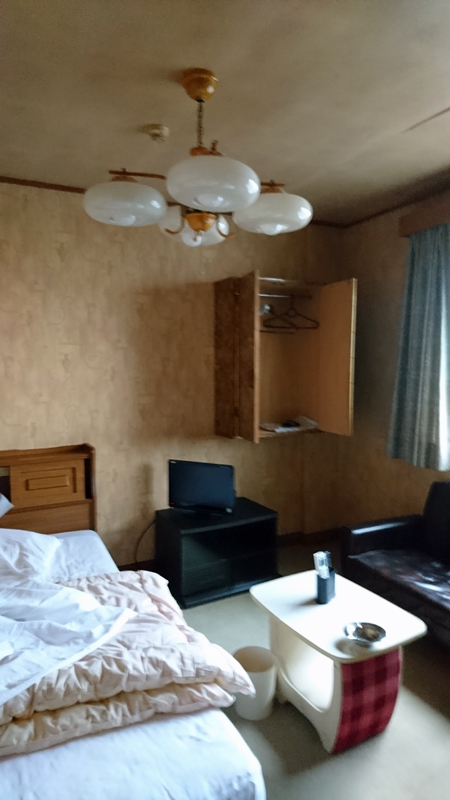 木下「....そこここのサイトでも紹介されていますが、失礼ながら意外とマトモなお部屋です。照明もなぜかLEDが入っていますし、風呂もあるし、枕元にトイレットペーパーもあるし。部屋全体激タバコ臭いけど」