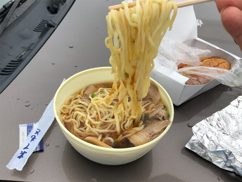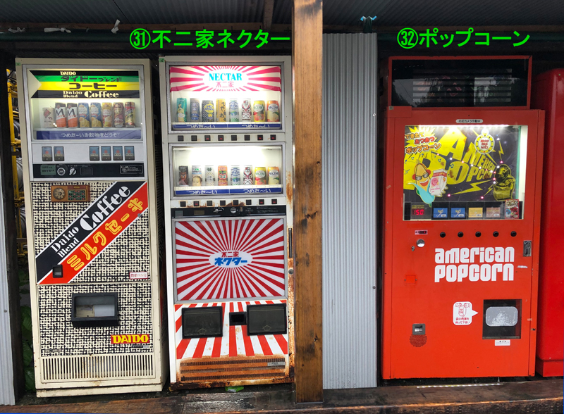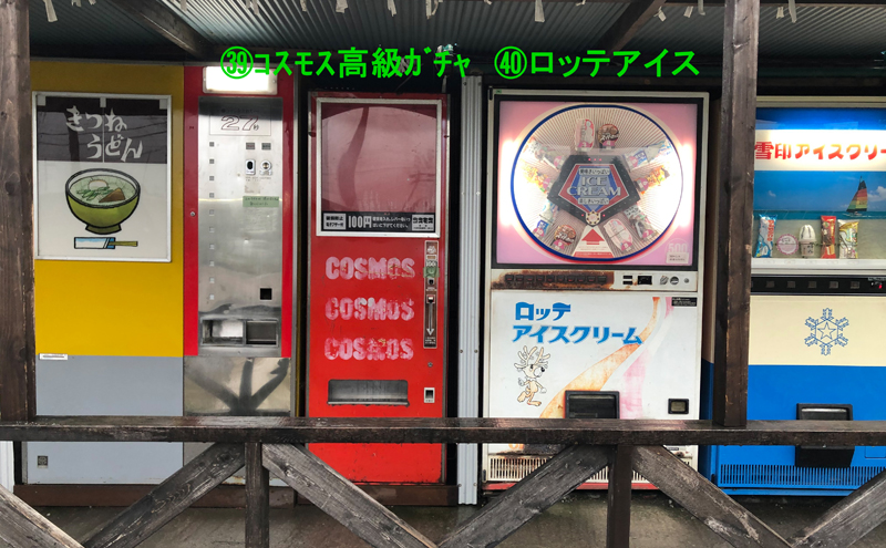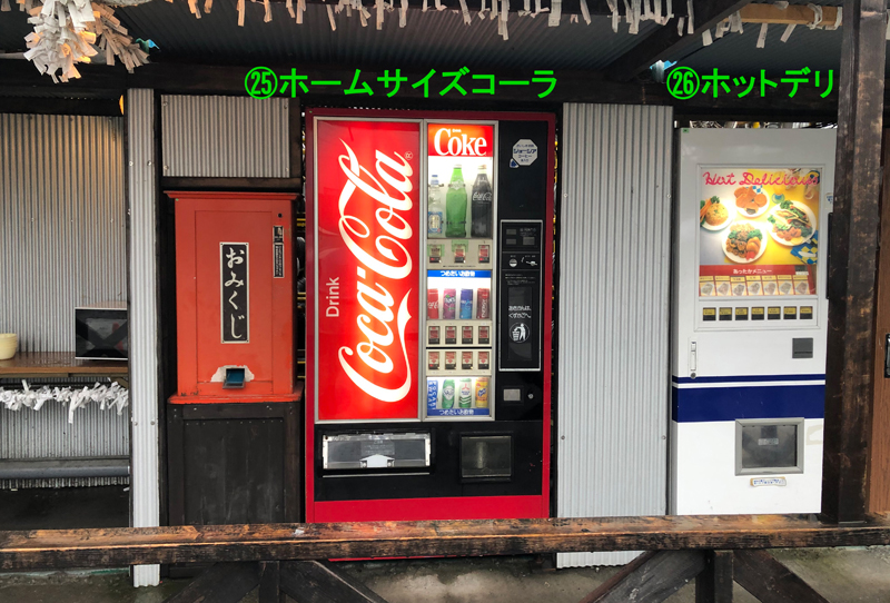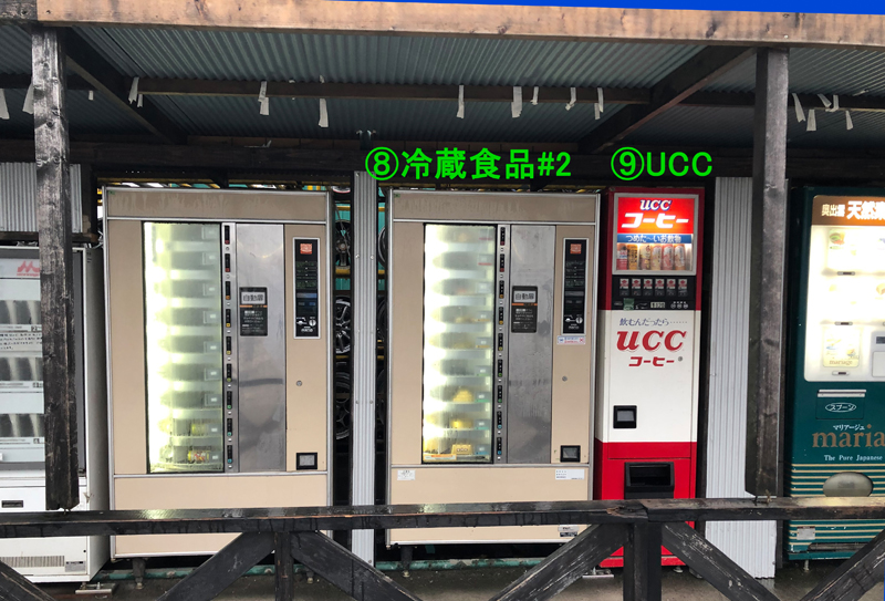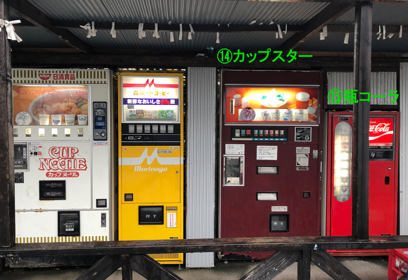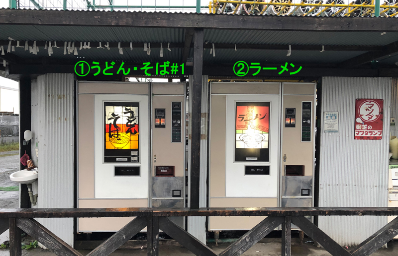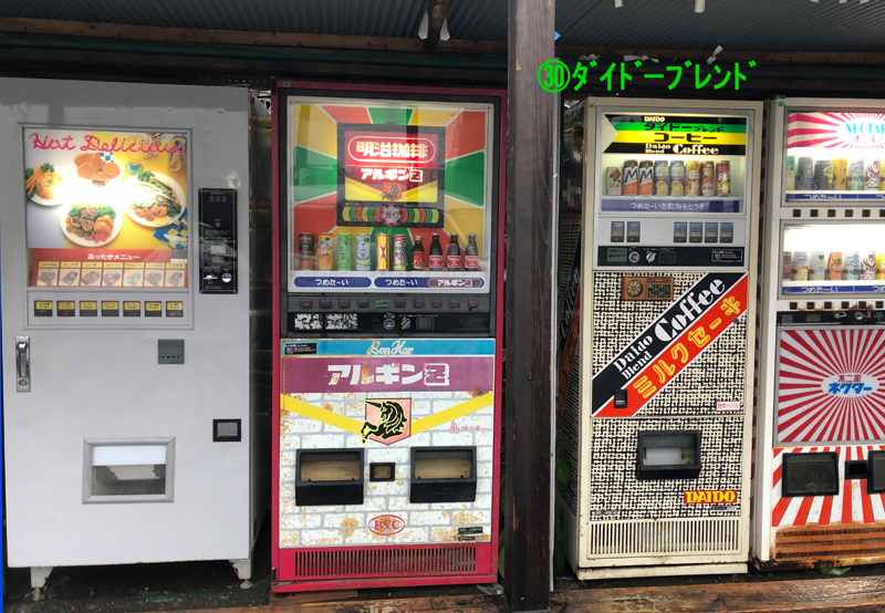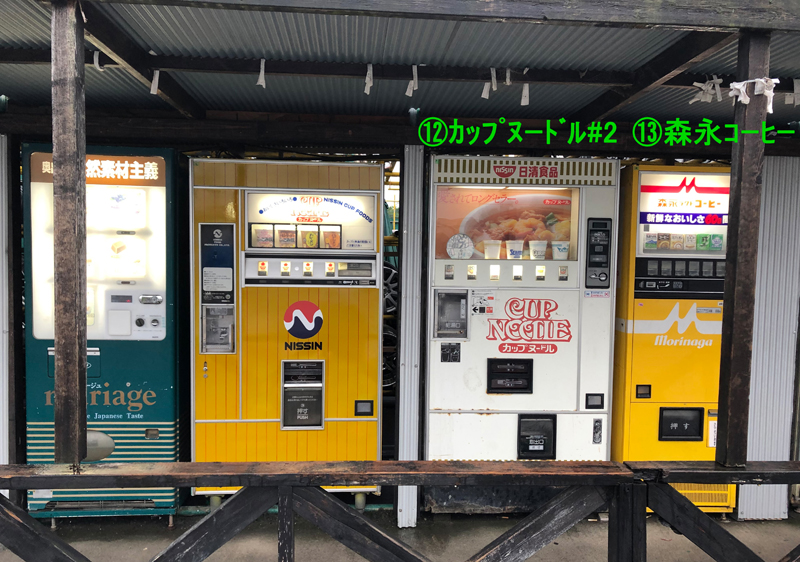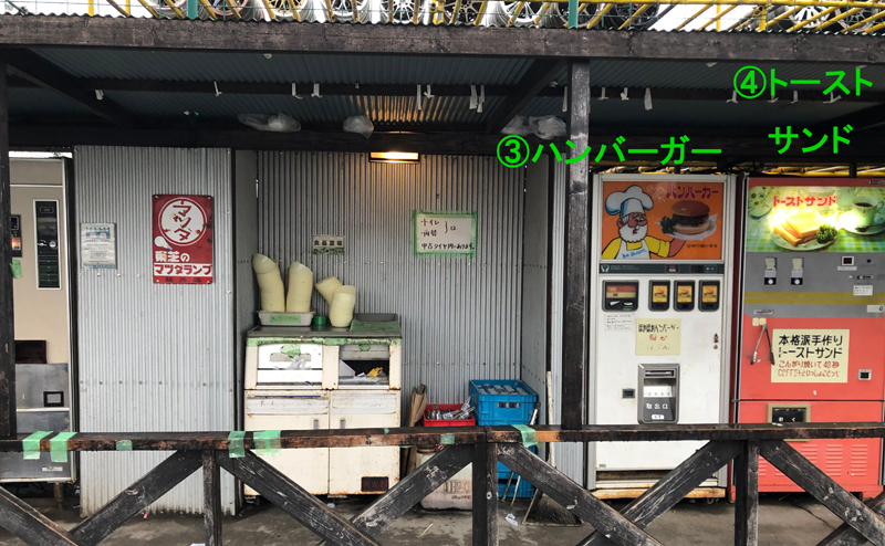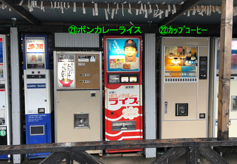 木下「ま、まあそれもしゃちょさんの虚仮の一念といいますか、とりあえずカウントした限りでは2020/06現在45+1〜2台の稼働/非稼働自販機が皆様のお越しをお待ちしておりますので、そっちの方が本業と言っても差し支えないと思われます。あまりにも多すぎて、パノラマ写真を企図した管理者さんの撮影画像がうまく合成できずtableタグを使う羽目になりましたしおすし」 小椋「管理者さんの撮影技術の○コさは今に始まったことではありませんが....しかし壮観ですな、麺類自販機の台数にも驚愕致しますが、宇宙に3台しか現存しないと断言しておられたボンカレー自販機の4台目がここに、最早曜変天目カレーという呼称は相応しくないかと」 木下「しかも予備機をお持ちだそうですからねぇ」 小椋「で、どうするんですか。パイレーツ宜しく左から順番に食っていきますか」 木下「我々を近海の食欲まぢん様か何かと思っているのですか....とりあえず、ここのメインディッシュは押さえておきましょう」 小椋「というと」 ![]() 小椋「なるほど、出発前に『煮卵入りラーメン自販機』を求めて西へ560km走るか、こちらへ向かうか思案されていた唯一無二(現時点)の自販チャーシュー麺ですな」 木下「フライング気味の註釈、重ね重ねありがとうございますた。こちらにはお箸とコショウー、いずれもご用意しております」 小椋「何故そこで伊吹PAの如く伸ばす....」 ![]() 木下「で、こちらがそのお品。これで400円也」 小椋「この手のチャーシュー5枚のせで+¥100というのはなかなかに良心的ですな。ですがこのアオサのようなものは」 木下「それが流石は家系発祥の地(の近くw)と申しますか、具材に海苔を投入していたものと思われます」 小椋「湯洗いを2度行なった上でスープを投入するマシンでですか」 木下「結果海辺の道の駅などで供される『海鮮ラーメン』の類いに微妙に似た感じになっていると思われ」 小椋「ちなみにお味は(ずぞぞぞ)...家系とは似ても似つかぬ走召薄味」 ![]() 木下「そこはほら、ましん系あるあるです。混ぜてみると...あーやっぱり」 小椋「なるほど、例のカップ焼きそばもかくやと思わせるガウナ麺、しかもこれ、なかなかにコユイ味になりますよ」 木下「ダルマと同じ醤油味....というか、ベース味ももう少し濃厚方向に振ったものを使っているのではないでしょうか。しゃちょさんの気合いを感じさせる一品となっております」 ![]() 木下「汁物がきたら、次は固形物」 小椋「炭水化物とタンパク質が大量に入っていたではありませんか」 木下「そこは別腹」 小椋「といいながら、深夜行のお供カフェインが胃にダメェジを」 木下「大丈夫だ、問題ない」 小椋「で、何故よりによってこちら」 木下「昨今の管理者さん、ニチレイを尋ねて三千里状態のようですから」 小椋「似ても似つきませんが」 木下「冷凍つながり」 小椋「や、やり...チープな電子オルゴォルが哀愁を誘いますなぁ」 ![]() 木下「なかなかに盛られた添加物の山」 小椋「それにしても意外とご近所で製造されてますな」 木下「まあこの手の自販機は自給自足が基本ですから」 小椋「....一応冷凍ですから、自前で調理は無理なんでは」 ![]() 木下「とまあ、この手の冷凍スナックにありがちなシワシワぷろだくつ」 小椋「しかしお味はというとパキッとした歯ごたえのソーセージが....か、固てェ」 木下「レンジ調理前未加熱品の割には、水分とんで皮がカピカピですな」 小椋「固くて黒くて、皮が剥けない」 木下「....何を想起しておられるのですか」 小椋「....何を想起させる形状にしているのですか>管理者さん」 ![]() 木下「さてこちら、もう一方のめいんでぃっしゅ」 小椋「確かこれ、前出のパイセンさいとによれば右側のボタンは『ツナトーストサンド』だったやに見えましたが」 木下「仕方ありませんな、昨今サバ缶に押されているとおりますから」 小椋「ではなぜサバ缶トーストにしないのでしょう」 木下「言ってみただけです」 小椋「や、やり....」 木下「まそれはともかく、ドキュメント72時間@公楽園でも取り出そうとして手に炎熱攻撃を食らっていた方がおられましたので、やさしいしゃちょさんにはトングをご用意頂いております」 小椋「わーい....てこれは感染防止的にはどうなんですか」 木下「その心配をされる方は、早朝5時にこんな所に来ていないと思います」 小椋「ふ、ふんがっくっく」 木下「は?」 小椋「おやつを飲み込んで喉に詰め、ぐうの音も出ない旧サザエさん」 木下「来週もまた見て下さいね〜♪」 小椋「おーい....」 ![]() 木下「でました、コレガ噂の」 小椋「前出サイトに書かれて(ry」 木下「ま、まぁ貴重なモノには違いありません。中身はともかく」 小椋「いやそれちげうだろ、中身『も』」 木下「で、では中身を....うーむ」 小椋「....これは....まあ普通のハムトーストです」 木下「公楽園のと比較すると、そうですな、アゲ太郎ぐらいか」 小椋「おっしゃっている意味
